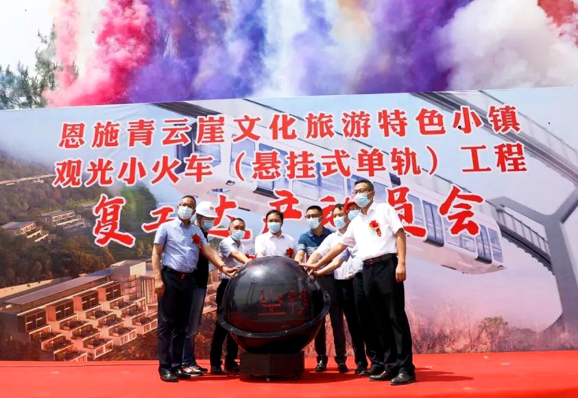 【中国中铁消息】 6月6日,由中铁六院、中铁工业等单位建设的中国首条“空轨”商业运营线——恩施青云崖旅游度假区崖壁观光小火车项目复工达产动员会在湖北恩施青云崖度假区举行,这标志着中国首条“空轨”商业运营线正式开工建设。
